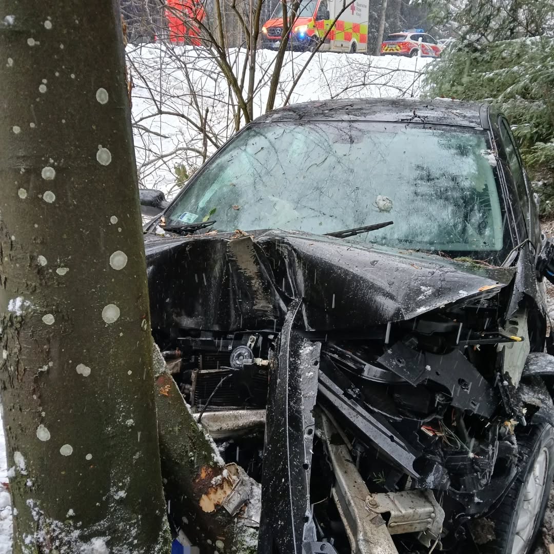 THL 1 – Autofahrerin stürzt auf B85 bei Zachenberg Böschung hinab und prallt gegen Baum