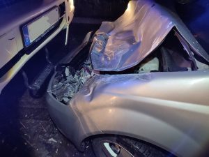 In das stehende Feuerwehrfahrzeug fuhr das Auto, das nur auf Sommerreifen unterwegs war, frontal rein, glücklicherweise wurde niemand ernsthaft verletzt. Am PKW entstand jedoch erheblicher Schaden.